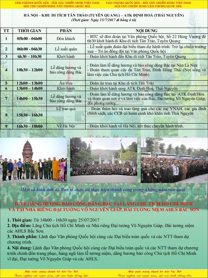 Kết thúc hành trình, Đoàn đại biểu sẽ tham dự Lễ dâng hương báo công tại Lăng Chủ tịch Hồ Chí Minh, nhà riêng Đại tướng Võ Nguyên Giáp, tượng đài các AHLS Bắc Sơn. Tiếp kiến lãnh đạo Đảng, Nhà nước tại Phủ Chủ tịch / Văn phòng Quốc Hội / Văn phòng chính phủ ngày 27.07.2017 và tham dự chương trình truyền hình trực tiếp trên Đài truyền hình Việt Nam ngày 27.07.2017.