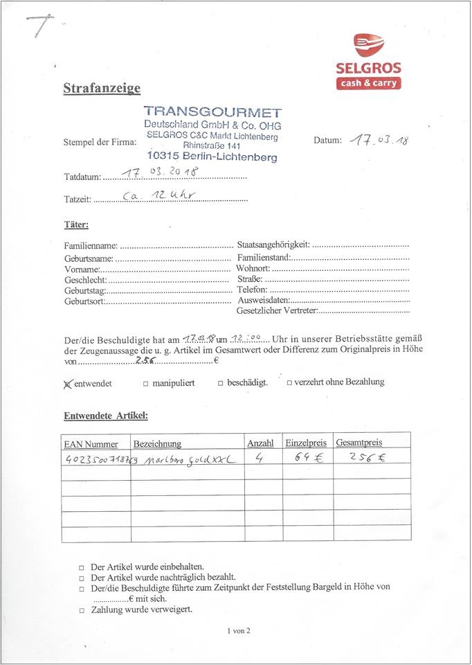 Lập Biên bản tạm giữ người Việt Nam ăn cắp thuốc lá hôm 17.3.2018 tại Selgros Berlin