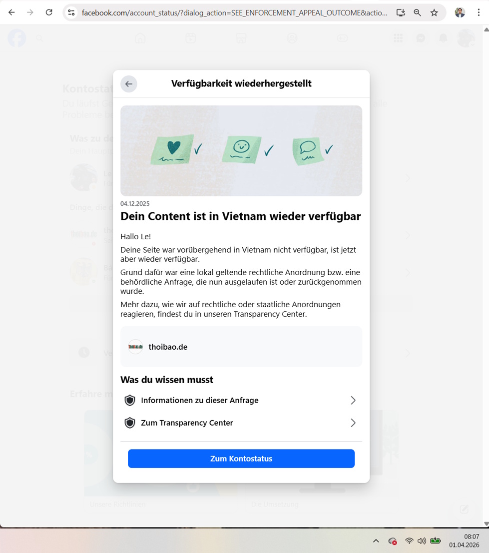 Im Dezember 2025 bekam Thoibao.de Mails von Meta, in denen stand, dass der in den USA ansässige Konzern alle Facebookseiten von Thoibao.de auf Verlangen der Hanoier Regierung für Vietnam temporär sperrt. Anderen Exilmedien in vietnamesischer Sprache erging es ebenso. Medien in Vietnam selbst sind sämtlich staatlich zensiert. Auf der Rangliste der Pressefreiheit von „Reporter ohne Grenzen“ steht Vietnam auf dem traurigen Platz 173 von 180 Staaten weltweit. Die Sperre ermöglichte es der Kommunistischen Partei Vietnams, ihren Parteitag im Januar durchzuführen, ohne dass die Bevölkerung nicht zensierte Informationen aus dem Ausland nutzen konnte.